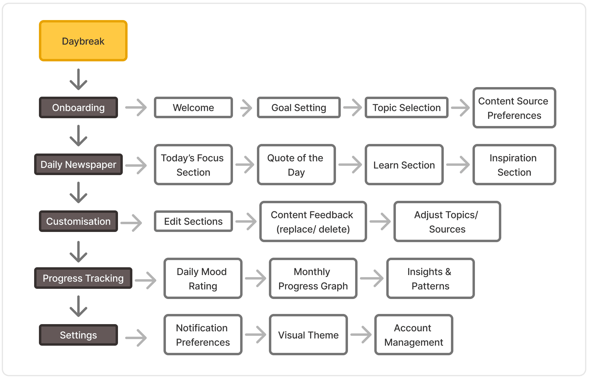 Flow 1: First-Time User Onboarding 1. Land on welcome page → 2. Introduced to Daybreak concept → 3. Select 3-5 main goals/themes → 4. Choose preferred content sources → 5. Set notification preferences → 6. Generate first newspaper → 7. Guided tour of features