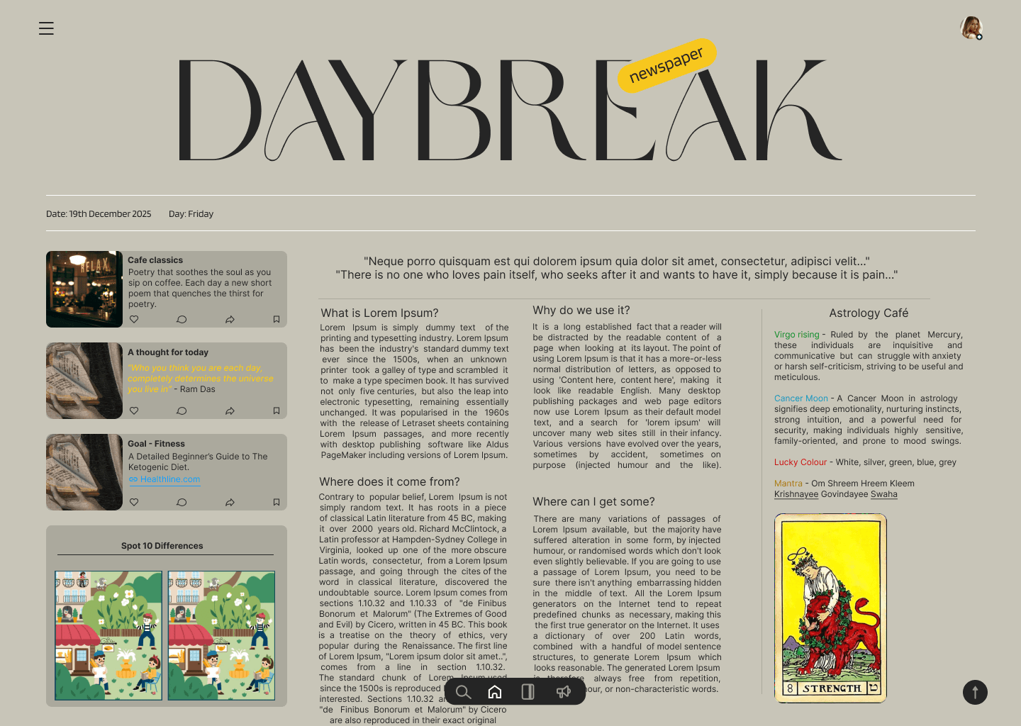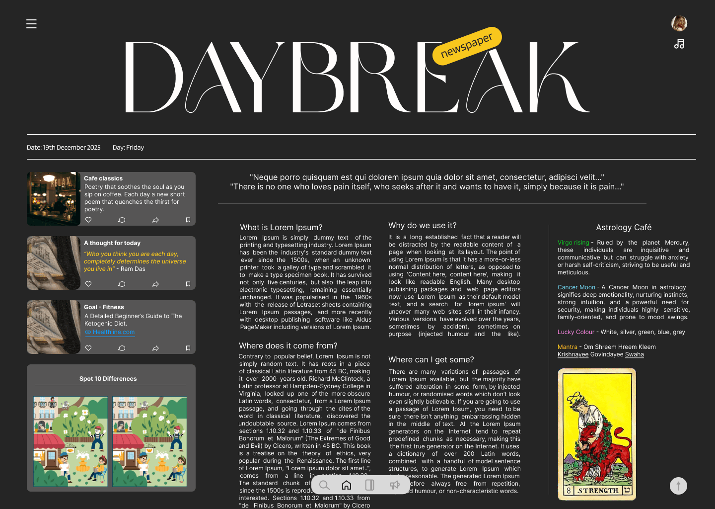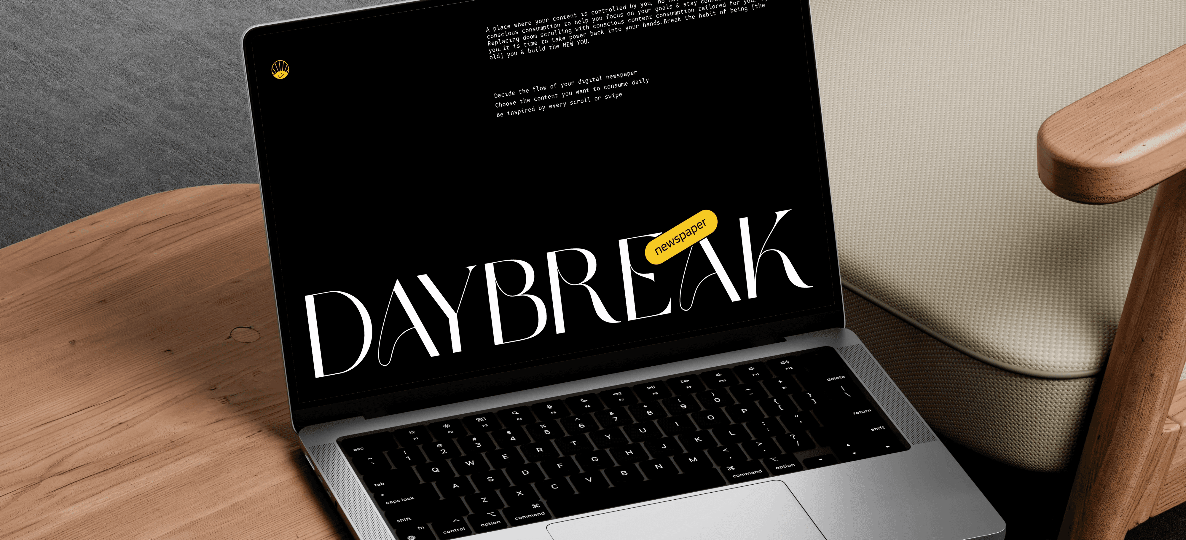 Daybreak is a desktop-first digital platform that reimagines the morning scroll as a curated, newspaper-style experience. Users receive personalised content aligned with their goals, interests, and aspirations transforming passive consumption into an intentional practice.