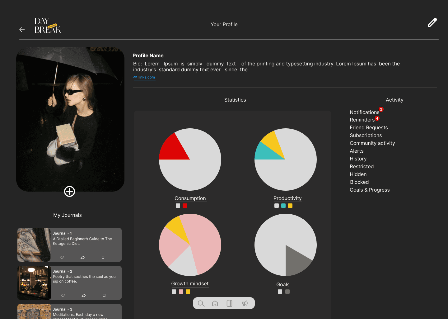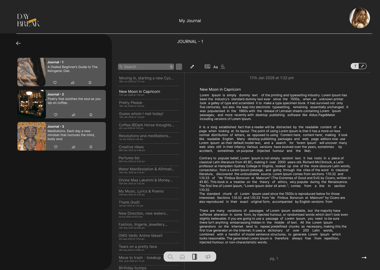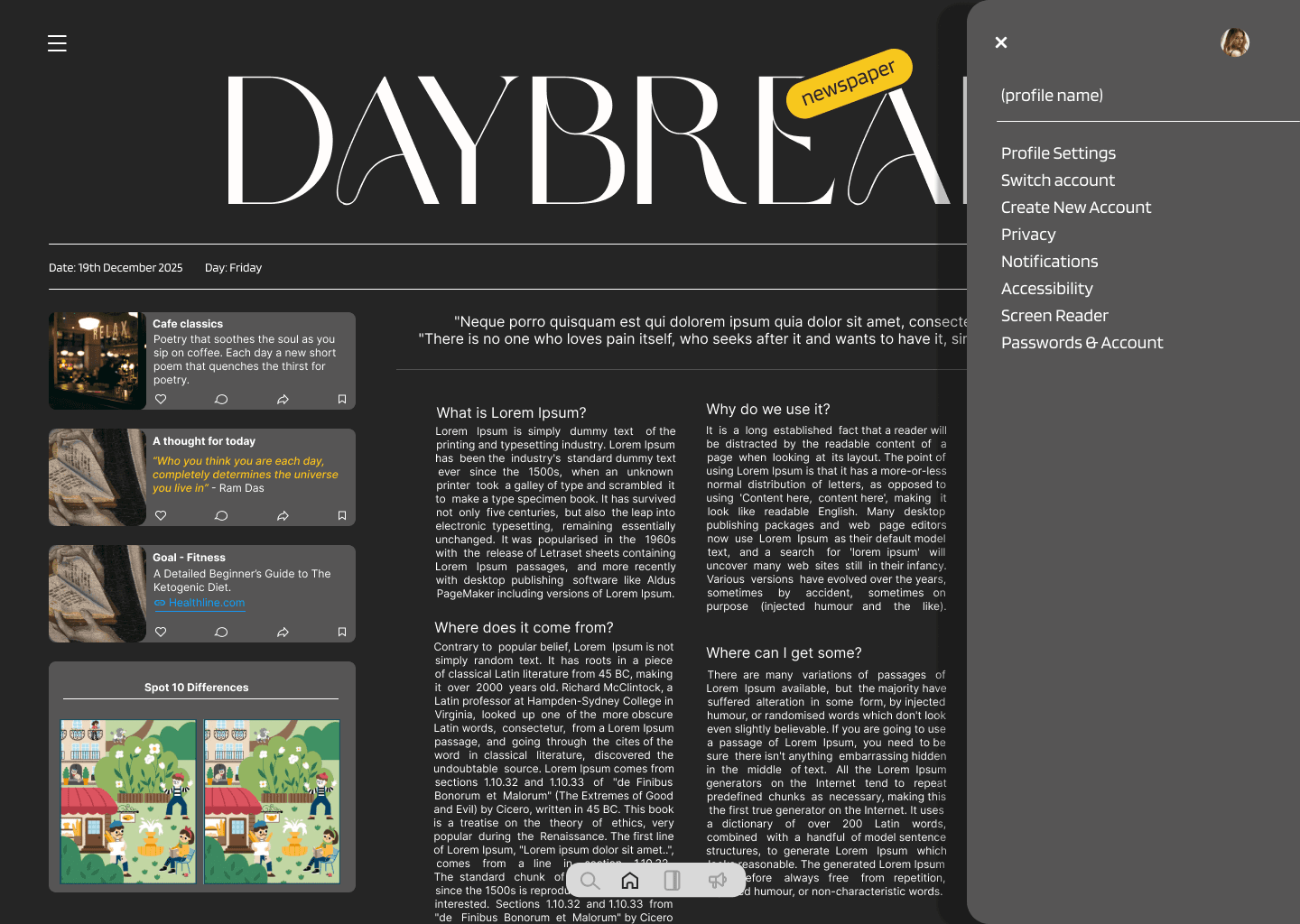 Daybreak is a desktop-first digital platform that reimagines the morning scroll as a curated, newspaper-style experience. Users receive personalised content aligned with their goals, interests, and aspirations transforming passive consumption into an intentional practice.